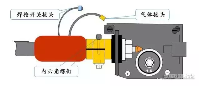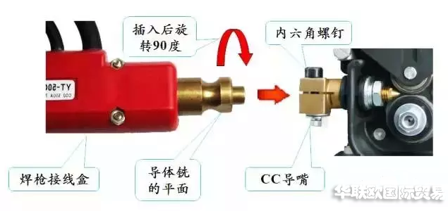 將BINZEL焊槍接線盒銅導(dǎo)體銑的平面處對(duì)準(zhǔn)CC導(dǎo)嘴的內(nèi)六角螺釘推入,再將接線盒旋轉(zhuǎn)90度后擰緊內(nèi)六角螺釘。