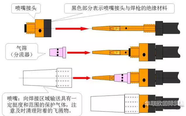 導(dǎo)電嘴與噴嘴應(yīng)保持良好的絕緣狀態(tài),氣篩除可使保護(hù)氣體分布更均勻,保護(hù)效果更好外,還可加大導(dǎo)電嘴與噴嘴之間的絕緣距離。焊接時(shí)應(yīng)使用防堵劑并及時(shí)清理噴嘴內(nèi)的飛濺物,使用防堵劑應(yīng)注意不要流淌到氣篩上,以免堵塞氣篩的氣孔,影響保護(hù)效果導(dǎo)致焊縫出現(xiàn)氣孔。