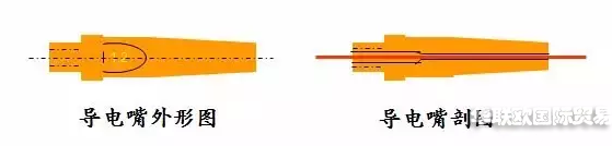 導(dǎo)電嘴是直接向焊絲傳遞電流的零件, 導(dǎo)電嘴內(nèi)孔與焊絲接觸而導(dǎo)電, 導(dǎo)電嘴外表面與噴嘴內(nèi)壁之間流過(guò)保護(hù)氣體。
