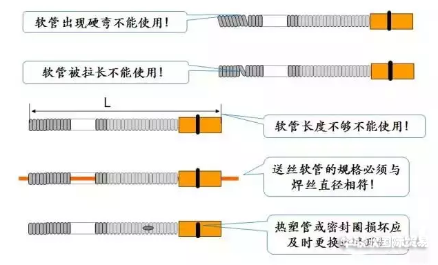 •長(zhǎng)度不夠:焊絲運(yùn)行時(shí)會(huì)在無(wú)軟管處增大彎曲,造成電弧不穩(wěn)。