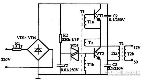 如圖所示。DAYKIN變壓器原理與開關(guān)電源工作原理相似,二極管vd1~vd4構(gòu)成整流橋把市電變成 直流電,由振蕩變壓器t1,三極管vt1、vt2組成的高頻振蕩電路,將脈動(dòng)直流變成高頻電流,然后由鐵氧體輸出變壓器t2對(duì)高頻高壓脈沖降壓,獲得所需 的電壓和功率。r1為限流電阻。電阻r2、電容c1和雙向觸發(fā)二極管vd5構(gòu)成啟動(dòng)觸發(fā)電路。 三極管vt1、vt2選用s13005,其b為 15~2 0倍。也可用c3093等buceo>=35ov的大功率三極管。觸發(fā)二極管vd5選用32v左右的db3或vr60。振蕩變壓器可自 制,用音頻線繞制在 h7 x 10 x 6的磁環(huán)上。tia、t1b繞3匝,tc繞1匝。鐵氧體輸出變壓器t2也需自制,磁心選用邊長(zhǎng)27mm、寬 20mm、厚10mm的ei型鐵氧體。t2a用直徑為0.45mm高強(qiáng)度漆包線繞100匝,t2b用直徑為1.25mm高強(qiáng)度漆包線繞8匝。 二極管 vd1~vd4選用 in4007型,雙向觸發(fā)二極管選用db3型,電容c1~c3選用聚丙聚酯滌綸電容,耐壓250v。
