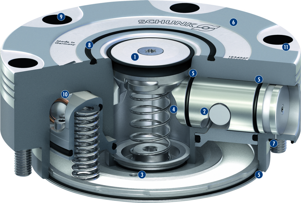 夾持過程由集成的彈簧組件執(zhí)行。動(dòng)力傳遞通過專利驅(qū)動(dòng)機(jī)構(gòu)實(shí)現(xiàn),它將有效的彈簧力轉(zhuǎn)換為定位銷的最大下拉力。夾持自動(dòng)鎖定,下拉力可在集成渦輪增壓功能的幫助下增加。可使用6 bar系統(tǒng)壓力打開。